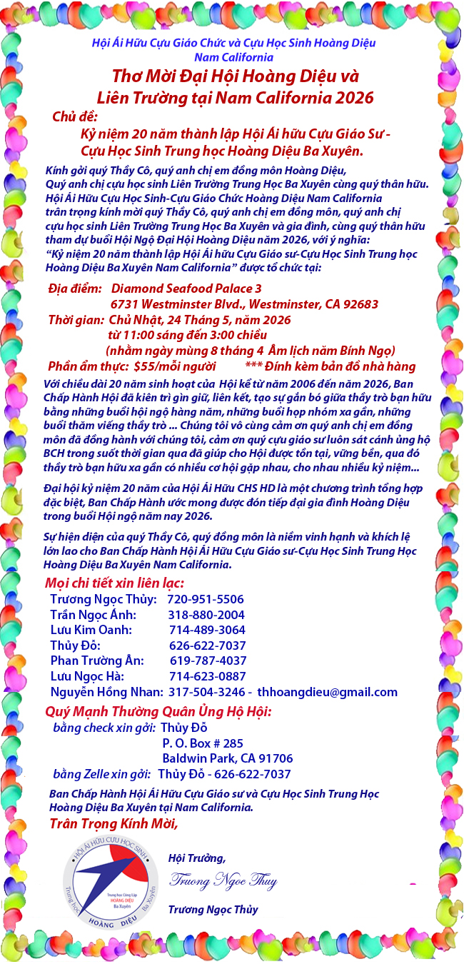 Thông tin Đại Hội Hoàng Diệu 20 Năm Thầy Trò Hội Ngộ tại Nam California