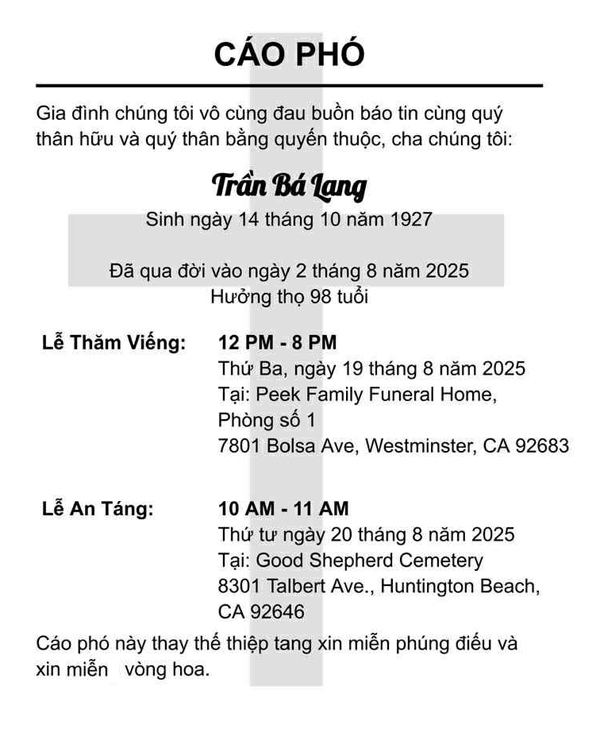 Địa Điểm Funeral Lễ Viếng An Táng Thầy Trần Bá Lang